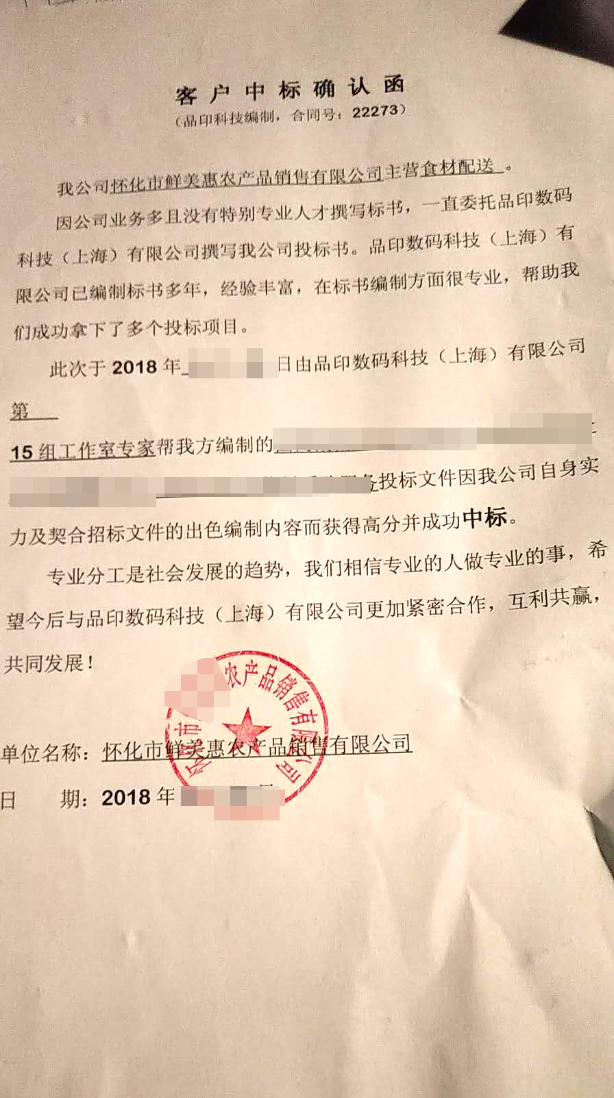 餐饮中标函22